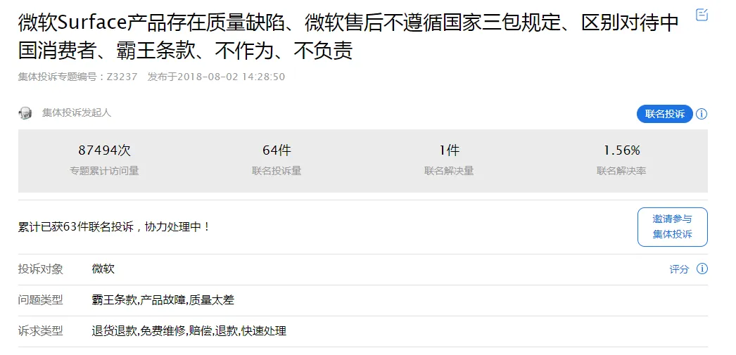 实际上,除了Surface Pro 4以外,早在2018年,微软Surface系列的其他产品同样被用户曝出存在屏幕闪烁等产品质量问题。在聚投诉平台上,有一条包含64个联名帖子的集体投诉,主要内容为Surface系列产品存在屏幕闪烁和抖动、电池鼓包、无法充电、微软售后服务未尽维修和免费换机责任等问题。