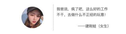 建刚蛙从来没有后悔或质疑过自己的选择,她一遍又一遍尝试说服父母。“我问我爸,你算一下自己每天躺在沙发上玩手机的时间多还是看电视的时间多?”在她看来,热门职业随着时代的前进不断在发生变化,昨天的“香饽饽”不等于今天的“铁饭碗”,有前景、收入高的工作远比别人的眼光和看法重要得多。