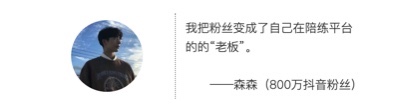 拥有800多万粉丝的抖音大V森森(网络昵称)最早也是一位游戏陪练,在一次接单中偶遇MCN机构的老板,后者被他幽默搞笑的风格所圈粉,森森很快成为了MCN机构的签约网红,迅速吸粉,也把许多粉丝变成了自己在陪练平台的的“老板”。