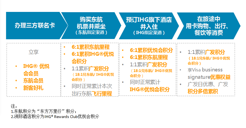 成功核发广发东航洲际三方卡的持卡人,可自动获得东方航空“东方万里行”会籍及IHG®优悦会会籍,在指定渠道消费,就能同时累积三方会员积分。按照规则,客户在东方航空及洲际酒店指定渠道每消费6元人民币(或1美元),可同时累积1点“东方万里行”积分、1点IHG®优悦会会员积分和6点广发积分。除东航和IHG渠道的三重积分,日常消费还可以1:1累积广发积分,该积分不仅可在发现精彩APP享受餐饮、购物等优惠权益,还可以在活动专区按18:1的比例兑换“东方万里行”或IHG®优悦会会员积分。