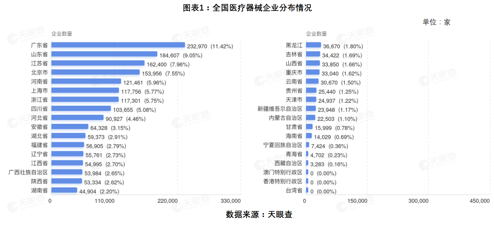 据天眼查数据,目前,全国合计有203.9万家医疗器械企业。其中,广东地区的企业数量最多,达23.29万家,占比达11.42%。