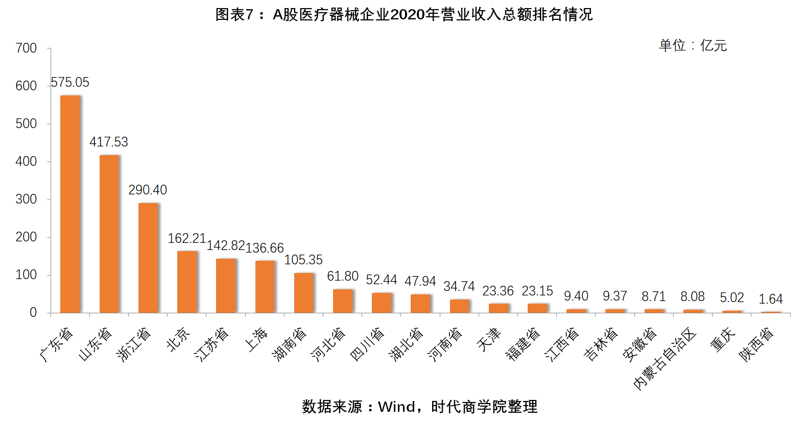 营收方面,2020年,全国仅7个省份的医疗器械上市公司总营收超100亿元。其中,湖南、上海、江苏、北京的上市公司总营收在100亿—200亿元区间,浙江、山东的上市公司总营收分别在200亿—300亿元、300亿—400亿元区间。总营收超500亿元的省份仅广东一地,达575.05亿元,比第二名多37.73%。