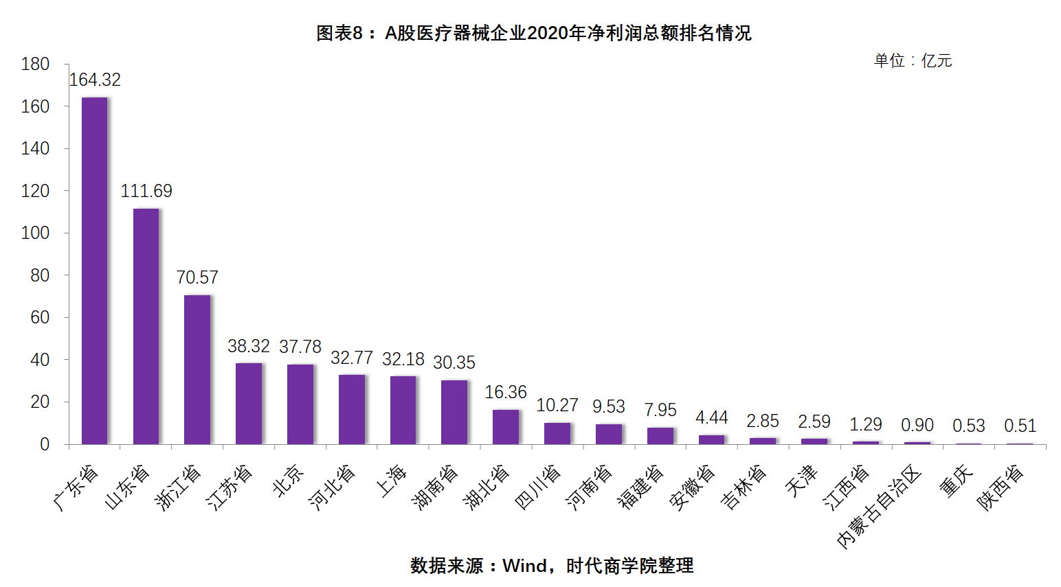 净利润方面,2020年,全国仅广东、山东两地的医疗器械企业净利润总额超100亿元,分别为164.32亿元、111.69亿元;企业净利润总额在50亿—100亿元区间的省份仅有浙江一地,为70.57亿元;企业净利润总额在10亿—50亿元的省份有5个;其余省份的企业净利润总额均在10亿元以下。