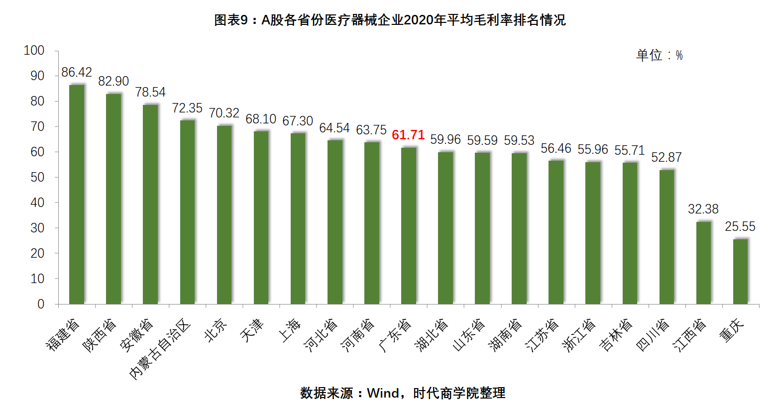 据统计,2020年,广东21家医疗器械上市公司的平均毛利率为61.71%,处于全国中等水平;排名靠前的为福建、陕西、安徽、内蒙古、北京,上述省份的企业平均毛利率分别为86.42%、82.9%、78.54%、72.35%、70.32%。
