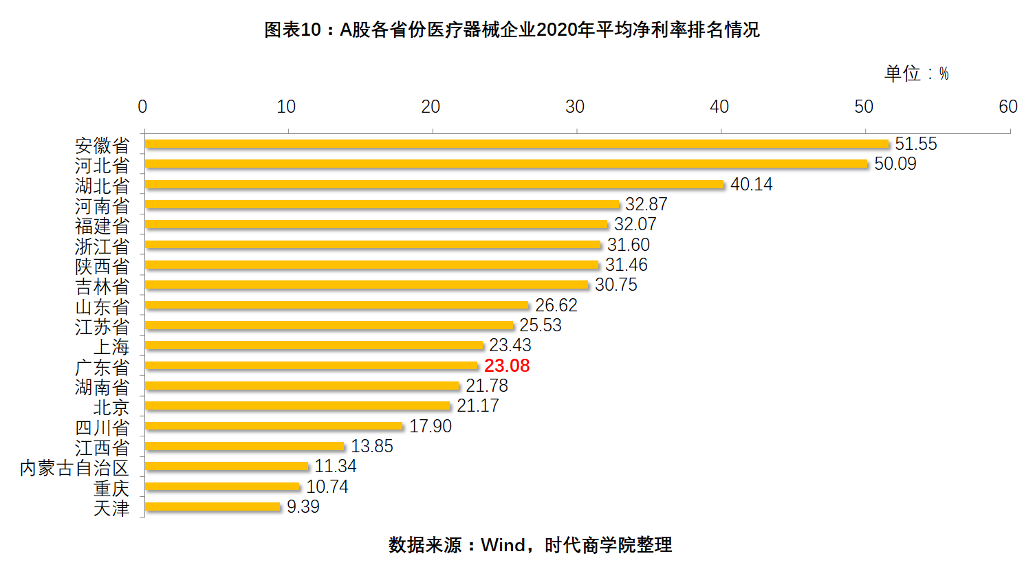 净利率方面,2020年,全国医疗器械企业平均净利率排名最高的省份为安徽省,达51.55%;广东省位于中下游水平,为23.08%;天津的净利率最低,为9.39%。