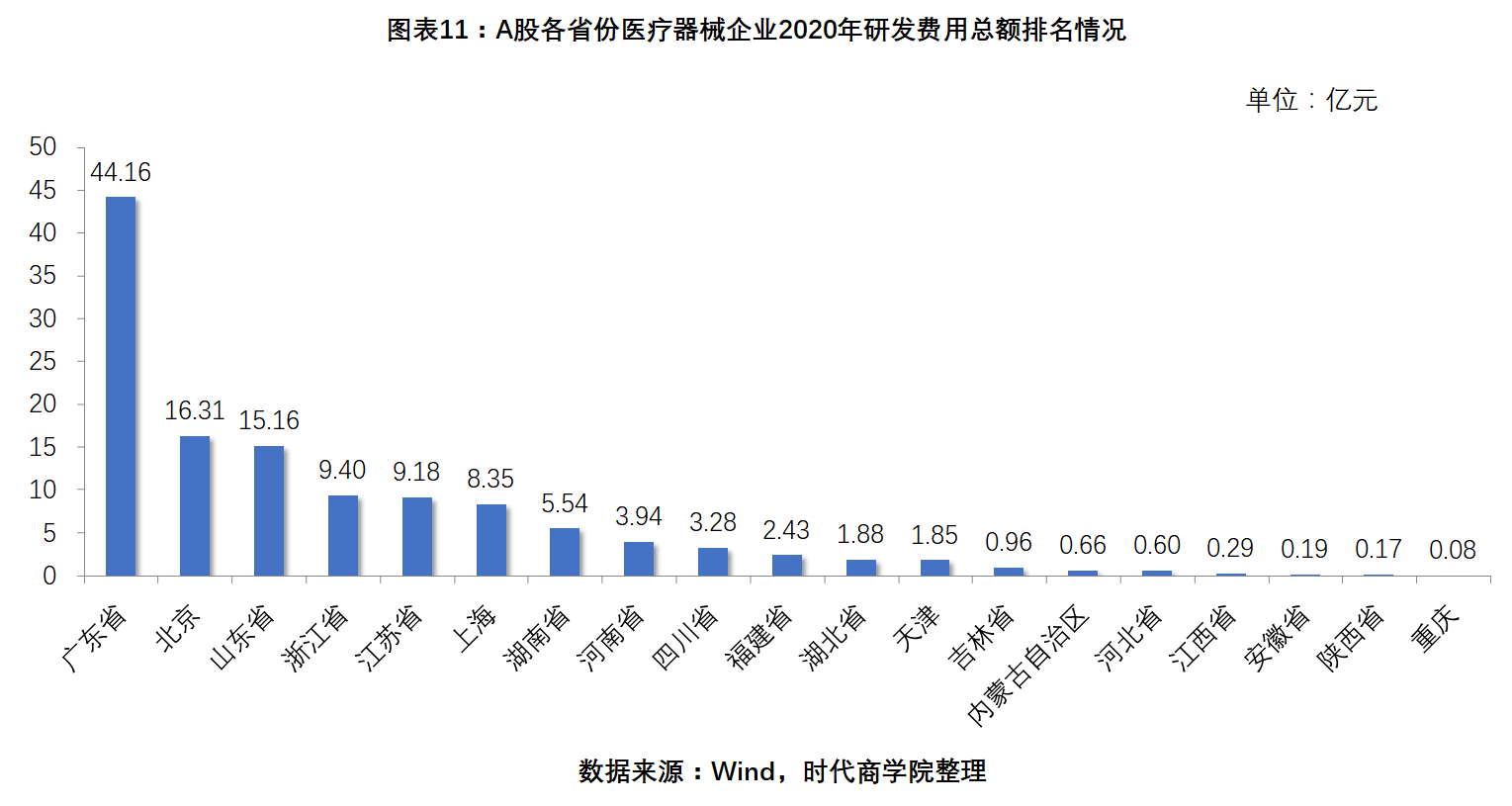 数据显示,2020年,全国95家医疗器械上市公司的研发费用总额为124.46亿元。其中,广东企业研发费用总额为44.16亿元,占比35.49%,位列第一;北京、山东企业分别以16.31亿元、15.16亿元的研发费用总额排名第二、第三,占比分别为13.1%、12.18%。
