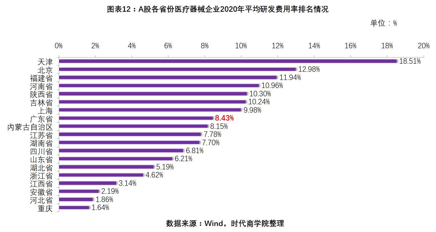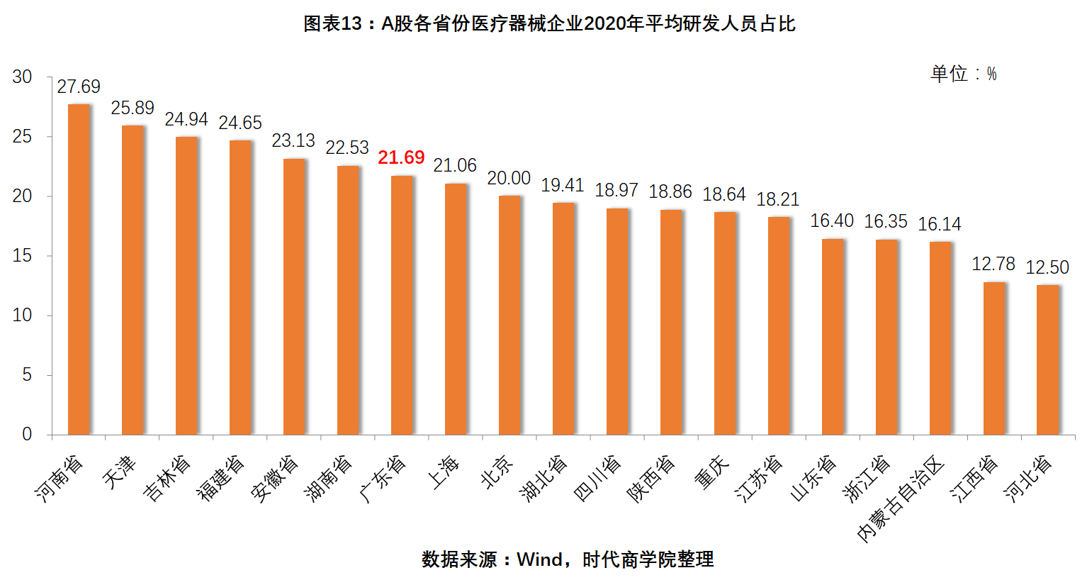 此外,全国95家医疗器械上市公司的平均研发人员占比(公司研发人员占员工总数的比重)为19.99%,广东排名第八,为21.69%。