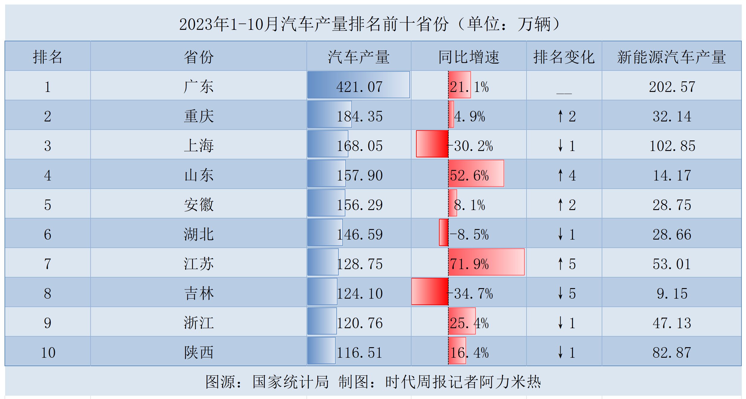与此同时,山东和江苏的汽车产量增长迅猛,同比增长52.6%和72.9%,排名上升4位和5位,分别位列第四和第七。而汽车产量长期排在全国前三的吉林,今年前10个月汽车产量同比下降了34.7%,跌至第八名。