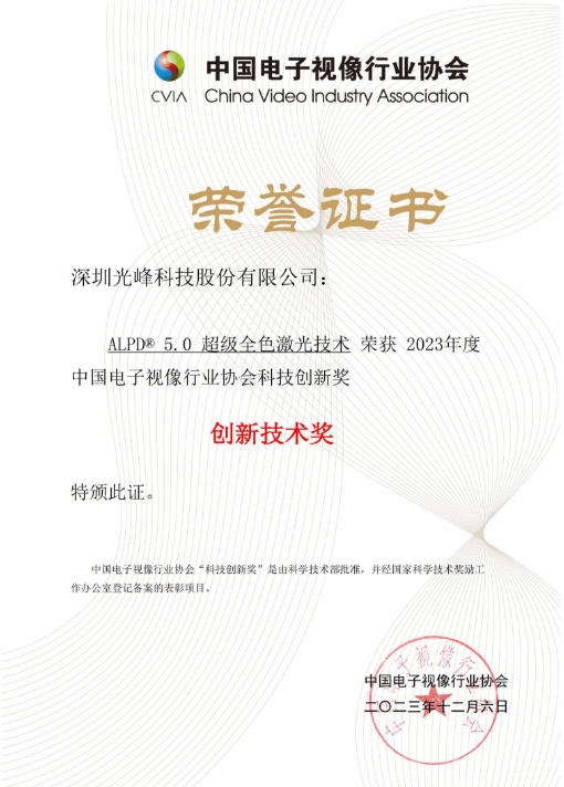 大会现场,光峰科技“ALPD5.0超级全色激光技术”(以下简称“ALPD5.0”)荣获2023年度中国电子视像行业协会科技创新奖·创新技术奖。这也是继2022年光峰科技再次荣膺该荣誉。