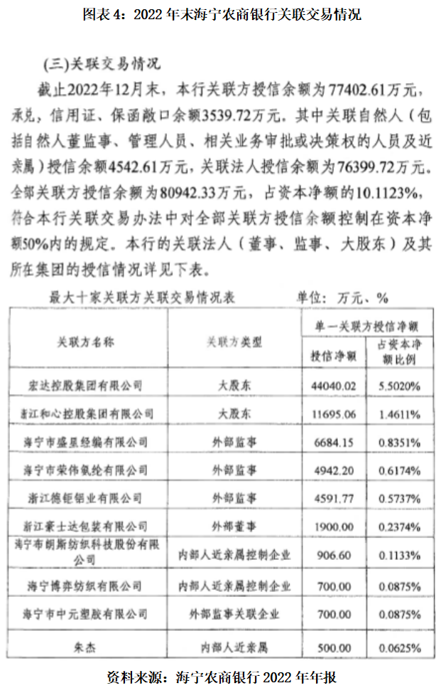 在关联交易方面,据2022年年报,截至2022年末,海宁农商银行对关联方的授信余额为7.74亿元,承兑、信用证、保函敞口余额合计为3539.72万元。其中关联自然人(包括自然人董监事、管理人员、相关业务审批或决策权的人员及近亲属)授信余额为4542.61万元,关联法人授信余额为7.64亿元。全部关联方授信余额为8.09亿元,约占资本净额的10.11%。
