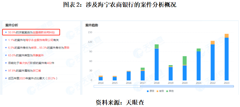 天眼查显示,2018年至2023年12月18日,涉及海宁农商银行的案件数量高达549起,案由以金融借款合同纠纷为主。其中,2023年以来,海宁农商银行的案件数量就达145起,仅2023年11—12月18日,海宁农商银行作为原告或首次执行申请执行人身份的纠纷案件数量就有21起。
