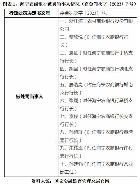 时隔不久,12月13日,国家金融监督管理总局官网披露一则对海宁农商银行及相关高管的行政处罚(嘉金罚决字〔2023〕7号)。