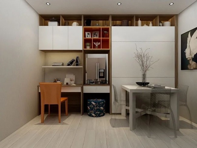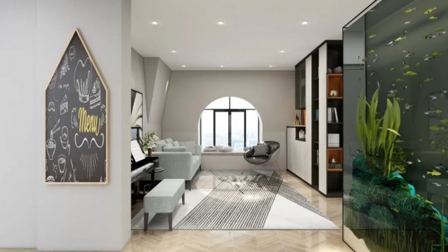 不同于大空间的居所,房间内的风格变化,往往趋于稳定。独居空间有更多可变化性,将原有的电视地带换成鱼缸,将娱乐区域切换成学习区域。