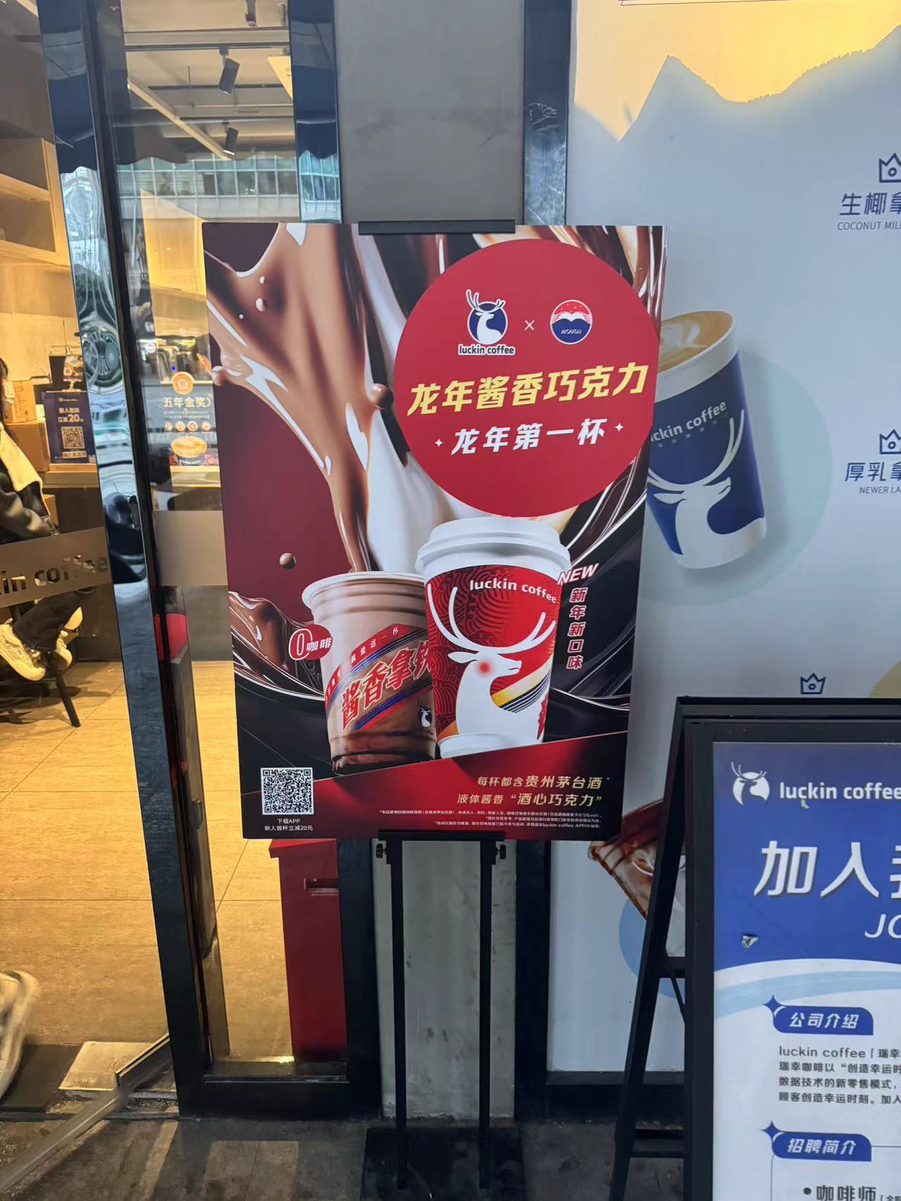 1月22日,贵州茅台与瑞幸咖啡联名的“龙年酱香巧克力”饮品正式开卖,售价38元/杯,优惠后价格为18元/杯。根据官方资料,龙年酱香巧克力使用白酒风味厚奶(含贵州茅台酒)、纯牛奶和香浓可可风味固体饮料,不含咖啡,酒精度低于0.5%vol。