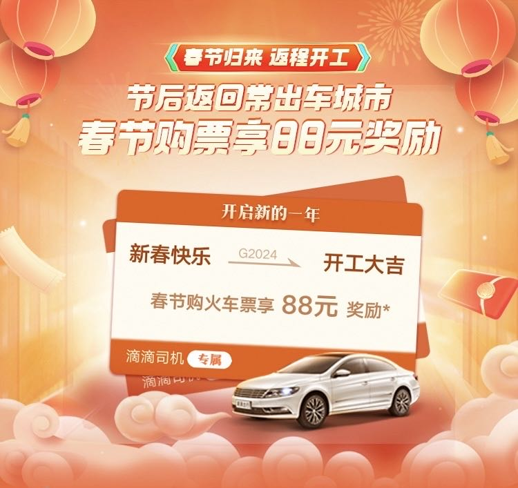 为了方便司机师傅返乡和返工,在北京、杭州、深圳、武汉、成都、苏州、上海、太原、大连等城市,滴滴推出了针对司机的春节车票奖励活动,最高可享88元福利奖励。司机师傅可在滴滴车主App报名参与活动领取,在1月29日-2月6日期间使用“滴滴出行”用户端app购买火车票,即可享受28元优惠减免,同时参与活动的司机师傅,在返工后还可获得最高60元的活跃营任务奖励。部分城市的司机师傅,还可组队参与新春团队PK赛,与小队成员一起领取最高1088元的奖金。