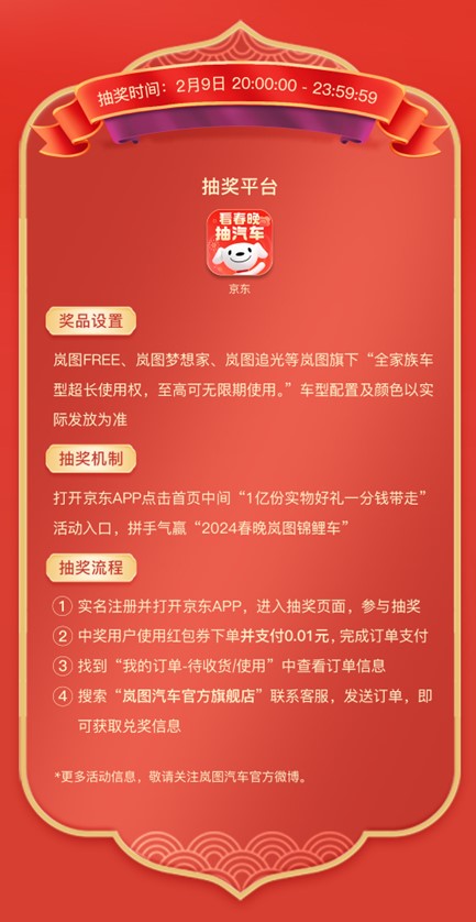 此次参与抽奖的100辆岚图锦鲤车活动十分简单直接。观众只需提前通过手机内置的应用商店搜索“京东”、下载安装京东APP,并完成账号注册即可参与活动。2月9日晚8点开始,只要跟随晚会主持人口播提示,打开京东APP,点击首页中间“1亿份实物好礼一分钱带走”活动入口,即可参与抽取100辆岚图汽车活动。此外,岚图汽车官方平台会不断发布最新动态,欢迎广大用户及时关注并参与抽奖活动。
