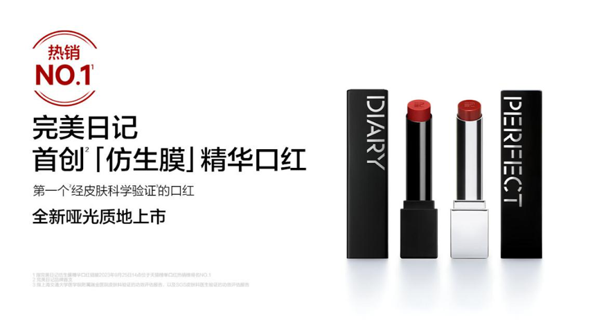 而仿生膜精华口红上市之后也迅速崭露头角,赢得消费者的青睐与好评。从2023年9月上市到12月底,仅用不到3个月时间,仿生膜精华口红销售额就突破1亿,荣登多平台口红排行榜NO.1,成为完美日记在“妆养一体”发展的里程碑式作品。