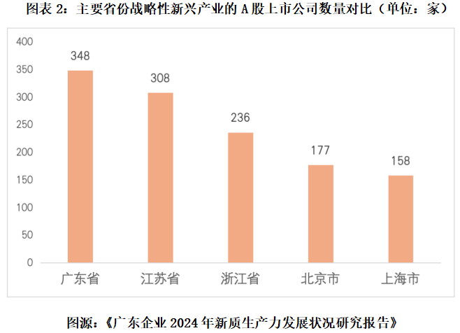 不仅如此,截至2024年6月5日(含),广东省共有876家A股上市公司,其中348家属于战略性新兴产业,高于江苏省(308家)和浙江省(236家)。从行业层面看,广东战略性新兴产业的A股上市公司主要集中于新一代信息技术、高端装备制造和新材料产业。