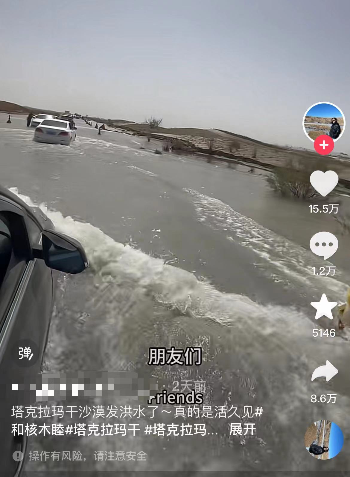 近日,不少网友发视频称,自己在新疆塔克拉玛干沙漠遇到了洪水。多个视频显示,洪水淹没至道路,很多车辆因此熄火。