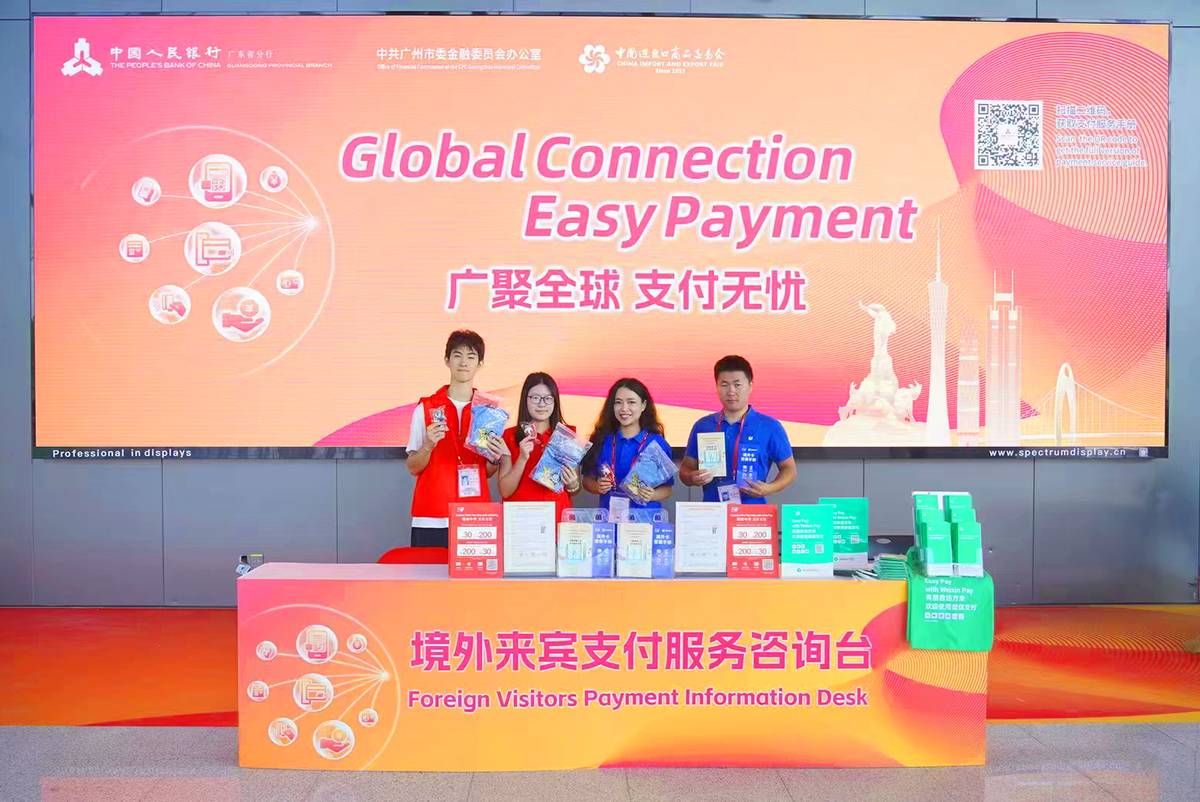 在广交会展馆内,广东银联积极落实人民银行广东省分行部署及银联总公司工作安排,为参展客商提供“丝滑”、无障碍、多样化的支付服务。广交会展馆内B区珠江廊桥中,核心点位均布放有“锦绣中华 支付无忧”统一主题的醒目广告。此外,广东银联配合人民银行在广交会展馆B区12-4服务台与D区到达大厅等核心位置设置“境外来宾支付服务咨询台”,精通外语、熟悉涉外支付业务的工作人员为参展客商提供支付服务咨询,覆盖广交会三期全程。