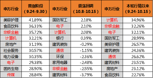 以国庆假期为分界线,A股市场自9月24日以来,迎来了泾渭分明的冰火两重天行情。Wind数据显示,9月24日至9月30日期间,上证综指、沪深300、创业板指分别大涨21.37%、25.06%和42.12%,牛气冲天;而在10月8日至10月15日的节后回调中,三大指数则分别下跌了-4.05%、-4.03%和-4.10%,股市急涨后的震荡修整意味明显。