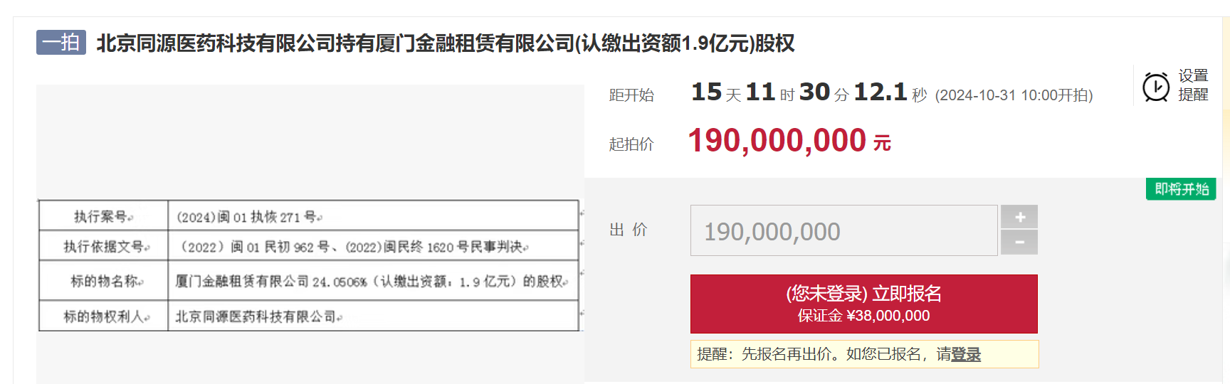 近日,阿里司法拍卖平台信息显示,北京同源医药科技有限公司(下称“北京同源医药科技”)持有的厦门金融租赁有限公司(下称“厦门金租”)股权将于10月31日在该平台公开拍卖,起拍价1.9亿元。