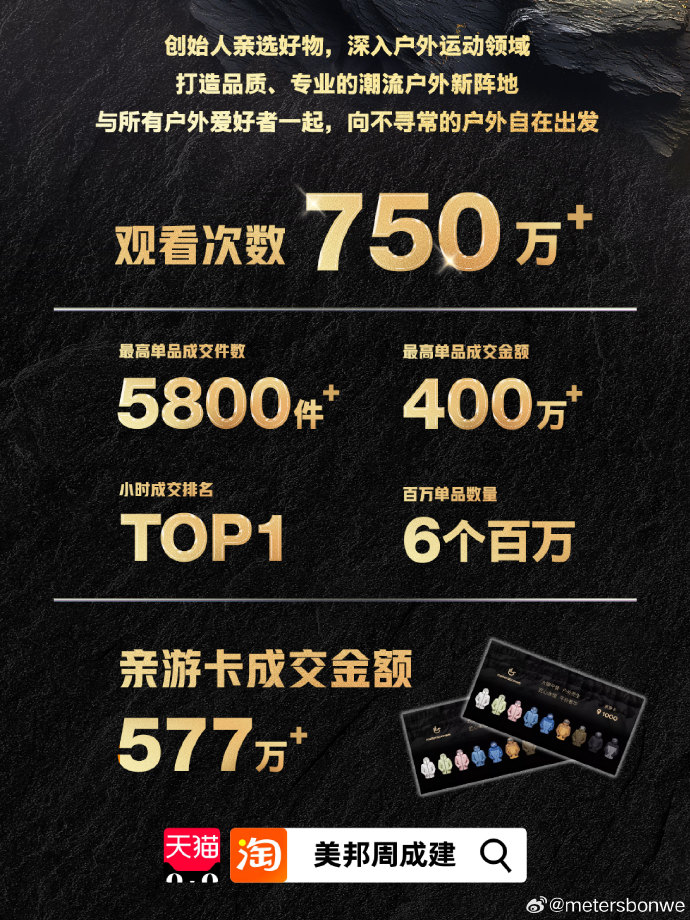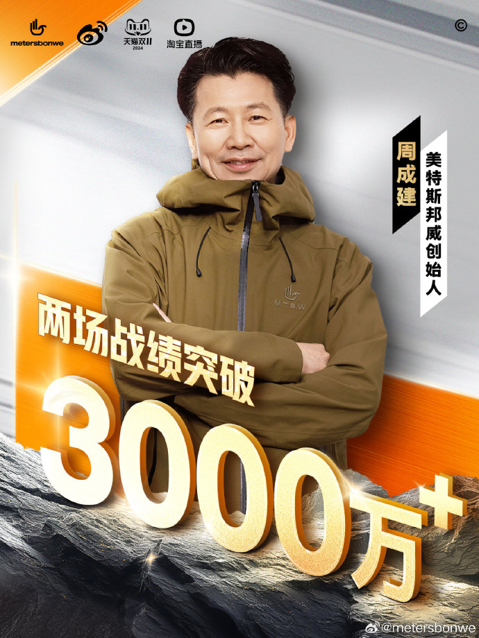11月7日,美特斯邦威创始人周成建正式公布淘宝直播二场战绩:成交额破3000万元,最高单品成交金额超400万元。周成建表示:“这次全新出发之旅,淘宝直播开场秀的结果是超预期的,对于直播间定位是创始人亲选好物,深入户外运动领域,打造品质、专业的潮流户外新阵地,与所有户外爱好者一起,向不寻常的户外自在出发。”