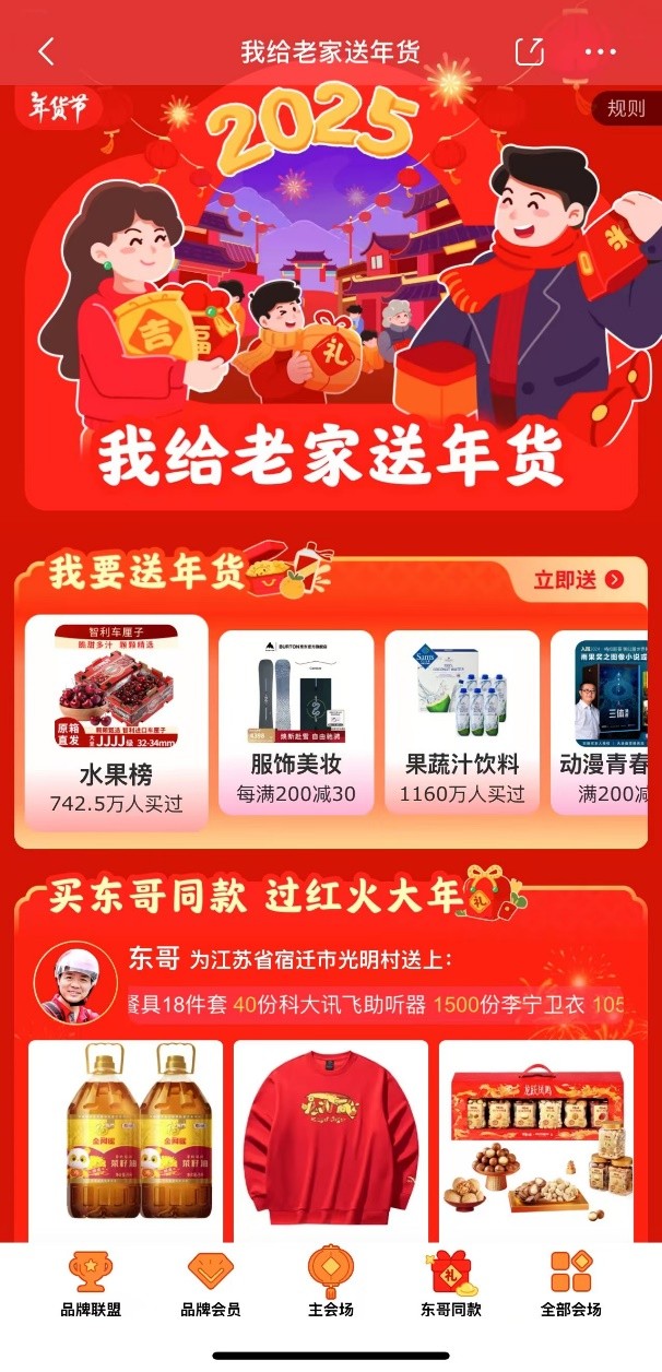 1月6日,京东联合超百大品牌、名人发起全国最大规模的“我给老家送年货”活动。值得一提的是,东哥也为江苏省宿迁市光明村送上了多款服饰美妆好物作为年货。其中,不仅有符合过年范围的红色安踏加绒卫衣、李宁卫衣以及猫人保暖内衣礼盒,还有老年人最爱的足力健雪地靴,还有能在冬日干燥天气里补水保湿的百雀羚护肤套装,数量均为1500份,无论是数量还是种类都非常丰富。即日起至2月12日,消费者打开京东APP搜索“我给老家送年货”,可为自己牵挂的家人送上新年祝福,还能买上东哥冬款服饰、美妆好物。