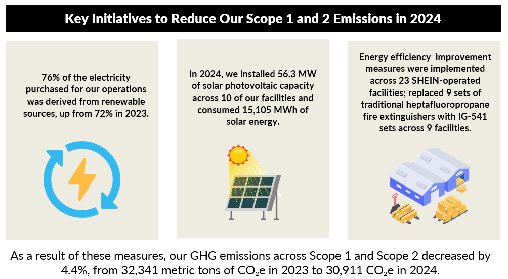 2024年,在可持续发展咨询公司Anthesis Group的支持下,SHEIN制定了脱碳路线图,以指导实现公司近期和长期减排目标。在减少范围1和范围2排放的路线图中,SHEIN优先采取了向可再生能源转型、提高能源效率以及逐步淘汰化石燃料、减少散逸排放三大行动。到2030年,SHEIN将通过增加光伏发电等形式,为所有直接运营的设施提供100%可再生电力,如今通过安装屋顶光伏等方式,SHEIN仓储物流园区等自营场所绿色电力的使用比例已达76%,并且在不断提升中;而加强能源消耗监测并升级直接管理设施的系统,可以提高能源效率并减少消耗;最后,通过向电动车转型等措施,逐步淘汰运营中化石燃料的使用。