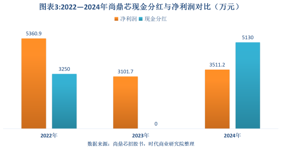 招股书显示,2022年、2024年,尚鼎芯分别向股东宣派及支付股息约3250万元、5130万元,共计派发股息约8380万元。按此计算,2022年、2024年,尚鼎芯分红的金额占同期净利润的比例分别为60.62%、146.10%,2024年的分红金额远超当年净利润,堪称“掏空式”分红。