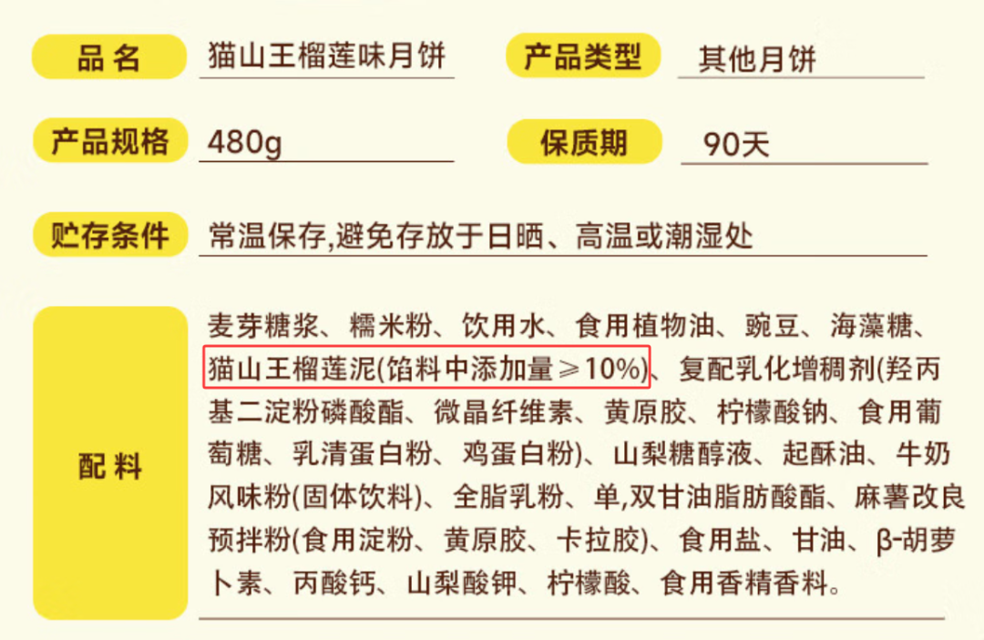 A2:配料表中应明确标示“榴莲果肉”或“猫山王榴莲果肉”等具体名称,且其排位越靠前,说明含量越高。若配料表前几位是 “绿豆蓉”“白芸豆馅”“冬瓜蓉” 等,而后才出现“榴莲调味酱”“榴莲香精”等,则表明其主要成分为替代馅料,榴莲含量极低,属于“榴莲味”月饼。