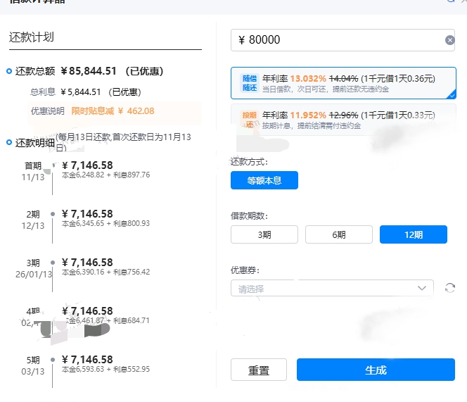 度小满的工作人员向时代周报记者展示了两份借款本金为8万元的还款计划,其中第一份是随借随还,不限定还款日期,年利率13.032%;另一份是按期归还,年利率为11.952%,利率低于前者,但需要在合同中约定3/6/12个月的还款期,并严格按照日期归还,如果提前归还,需要额外支付4%*未还本金的违约金。