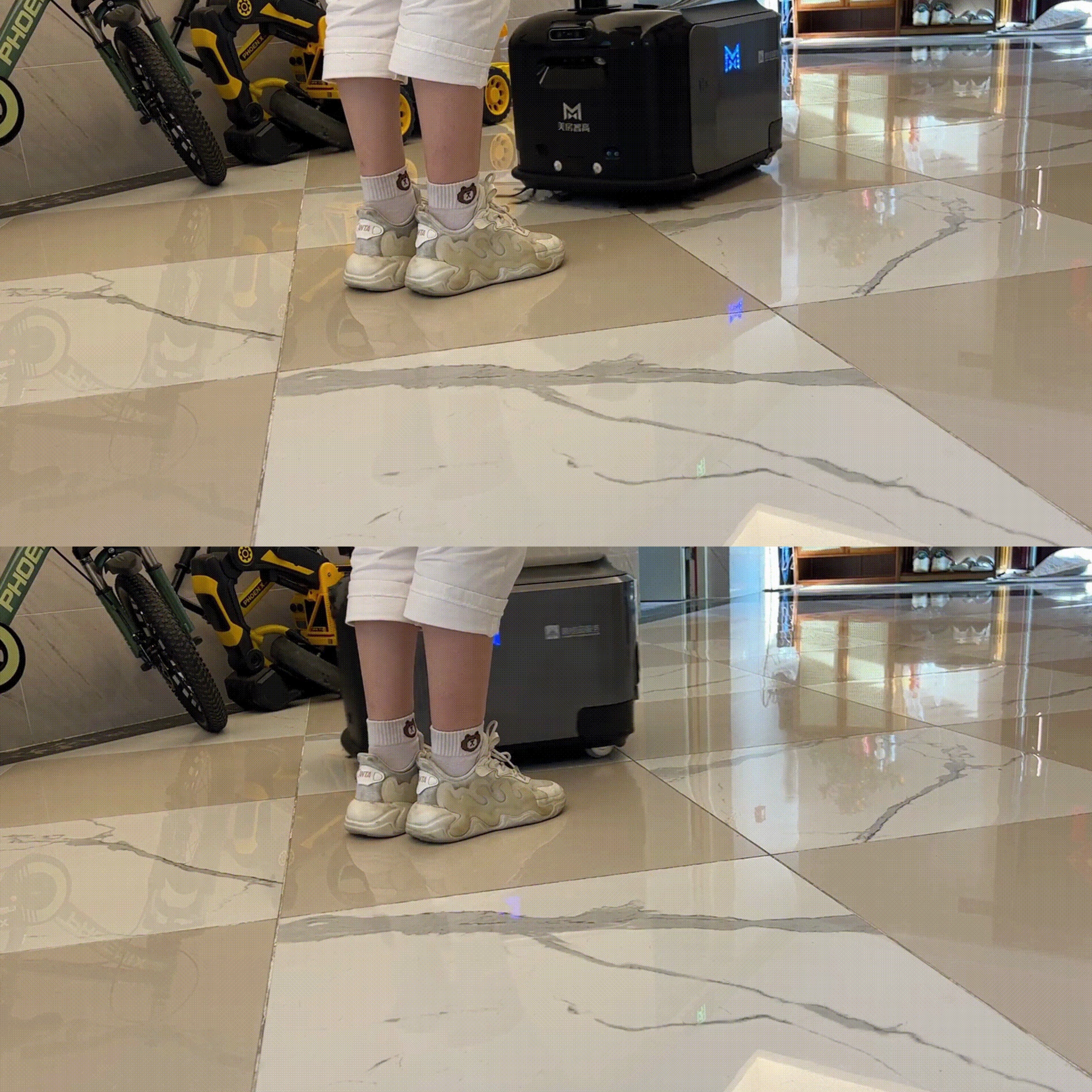 当天,工作人员现场展示并详细讲解了机器人的技术优势。与传统人工清洁相比,“零号居民”机器人在效率与洁净度上实现了跨越式提升,通过边刷聚拢、中扫卷入尘盒处理石子、螺钉、纸团等固体垃圾,独特的“活水洗地+浮动刮板”系统能即时回收污水,对酱油、可乐等常见湿垃圾实现“即洗即干”。针对无数南方人头疼无解的回南天,机器人也有独特的应对方案:机器人支持自动识别,当发现地面积水较多时,会自动触发滚筒提速等逻辑,加快污水回收速度。