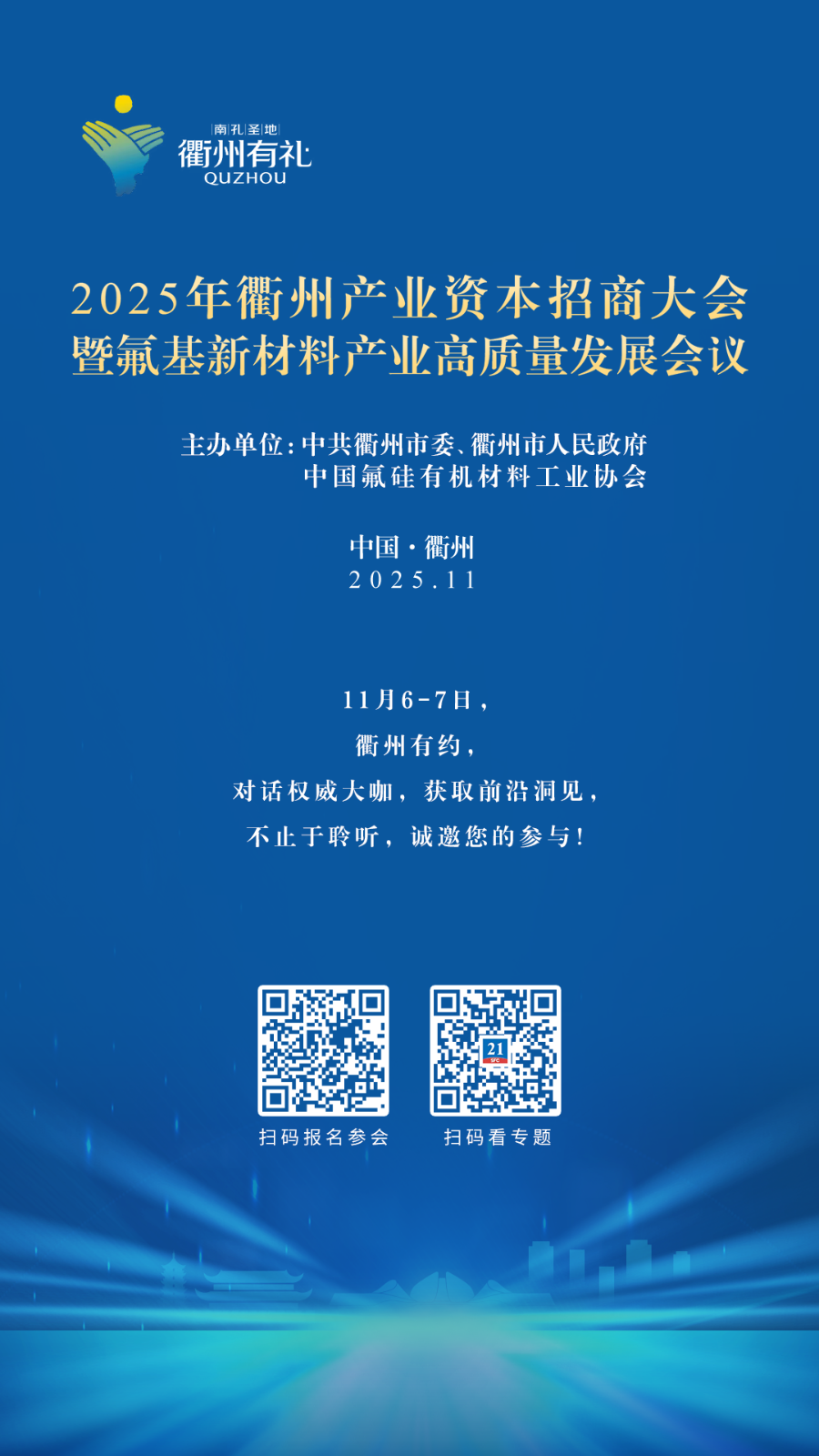 本届产业资本招商大会由中共衢州市委、衢州市人民政府、中国氟硅有机材料工业协会联合主办。