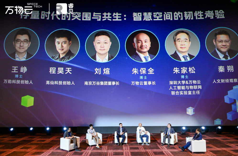 在圆桌对话环节,围绕“存量时代的突围与共生:智慧空间的‘韧性’考验”这一主题,第一财经日报创始人秦朔作为引导人,与万物云董事长朱保全、南京万谷集团董事长刘煊、深圳大学&万物云人工智能和物联网联合实验室主任朱家松、万勋科技创始人王峥、高仙科技创始人程昊天展开了深度探讨。
