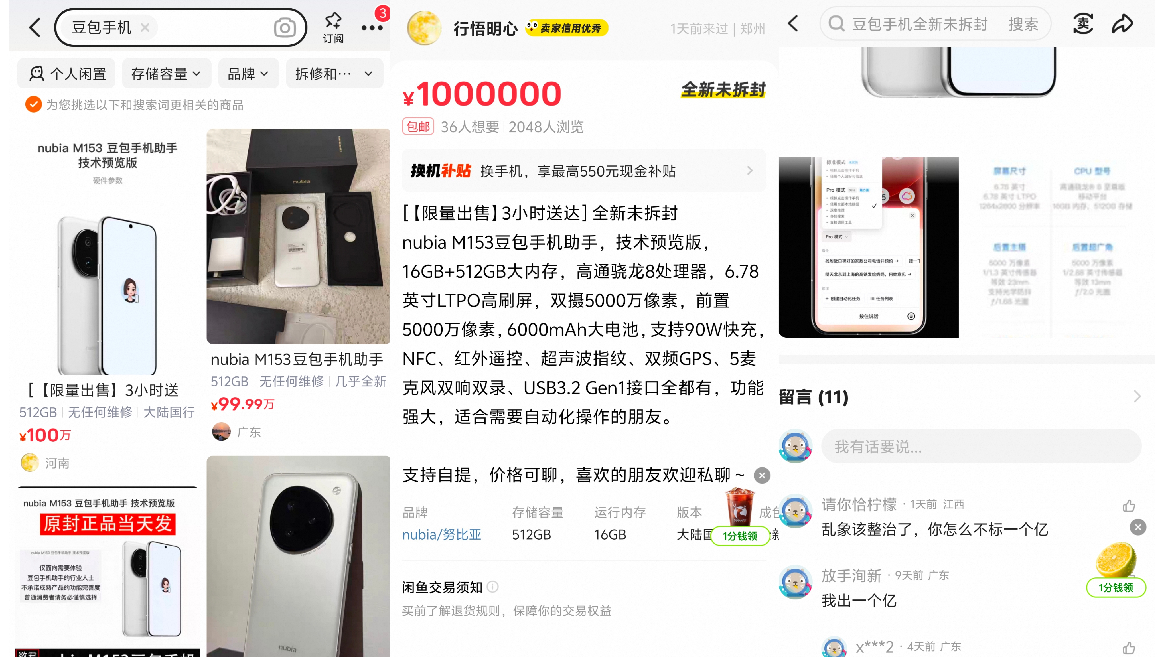 与此同时,时代周报记者注意到,在二手交易平台闲鱼上,豆包AI手机的最高标价已达到“100万元/台”的惊人天价。