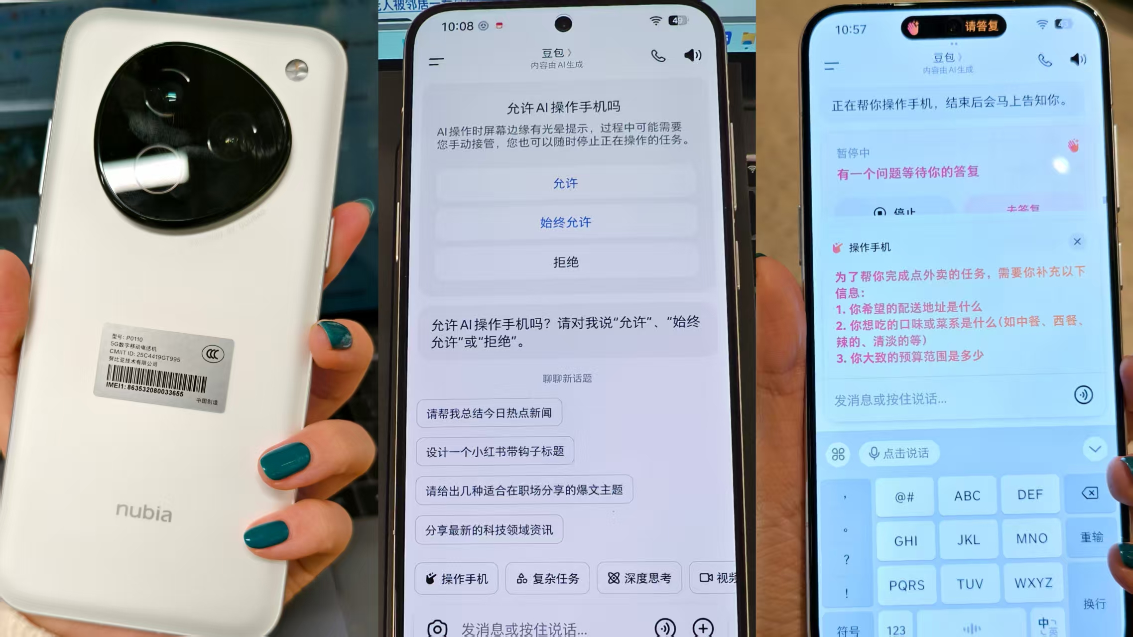 这款由字节跳动与中兴通讯合作推出、搭载豆包助手的手机,主打“AI代劳”功能:用户只需对AI助手下达指令,它便能自动打开App、搜索商品、完成下单、甚至能实现代打《王者荣耀》、代发消息、代刷视频等操作。