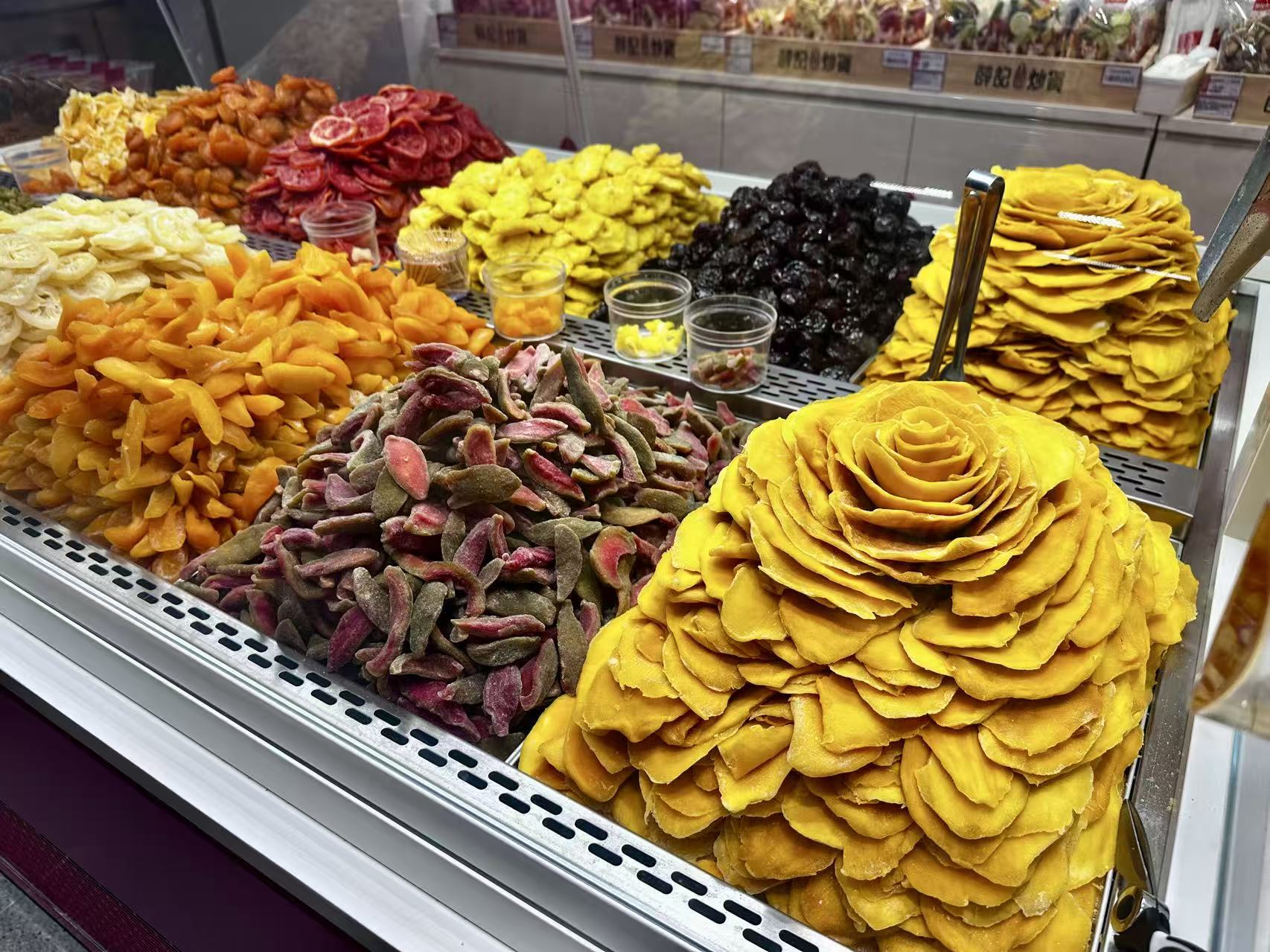 门店的芒果干摆成花束造型,搭配丰富的试吃,吸引了不少年轻人和小孩的关注。一位工作人员称:“我们是特意摆成花束形状,不然消费者怎么会停下来想尝试想买呢”。据其透露,这类摆放的风格与流程均为公司统一要求。