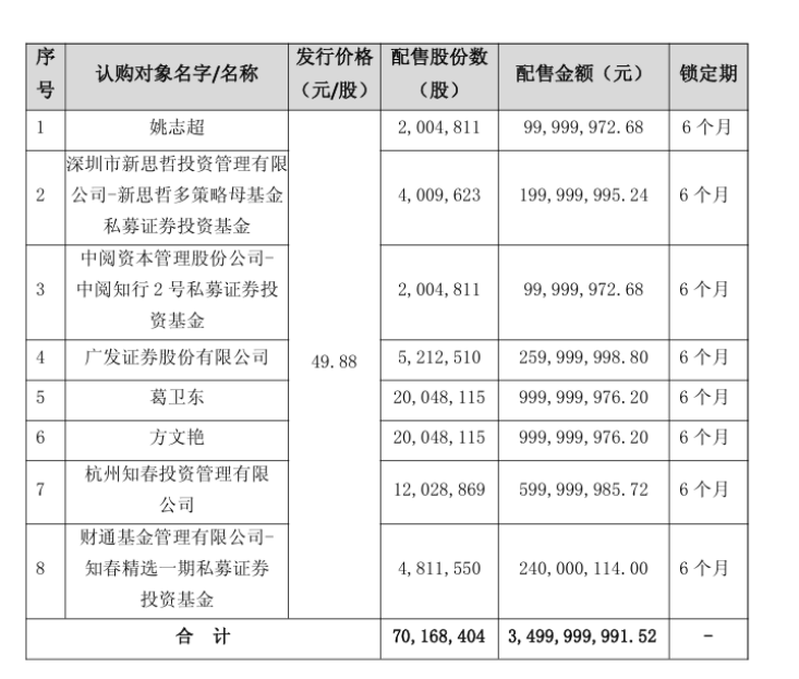 2月10日,江淮汽车披露的发行情况报告书(下称“公告”)显示,江淮汽车本次发行最终定价为每股49.88元,发行股份7016.84万股,募资总额约35亿元。公司按照“认购价格优先、认购金额优先、认购时间优先”原则,共确定8名认购对象。除葛卫东外,还包括方文艳、姚志超、深圳新思哲、中阅资本、杭州知春投资、广发证券、财通基金等。
