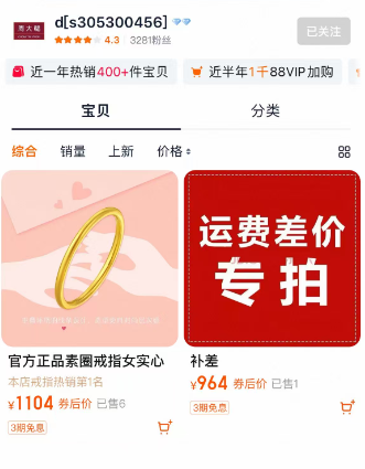 欧女士表示,该店铺还假借了“周大福”的品牌形象,声称自己是官方店。目前,该店铺改名之后,依然在销售一款1104元的“黄金戒指”。