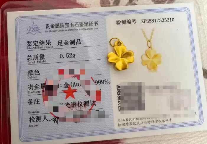 无独有偶,另一位消费者也向《消费者报道》记者报料称,今年3月,其在某电商平台上一家名为“中国金店精品店”店铺购买了一款“四叶草黄金吊坠”,也出现了假黄金问题。当她将该黄金吊坠送到线下金店鉴定时,店家用喷枪烧吊坠“验货”,结果吊坠直接露出银色物质。
