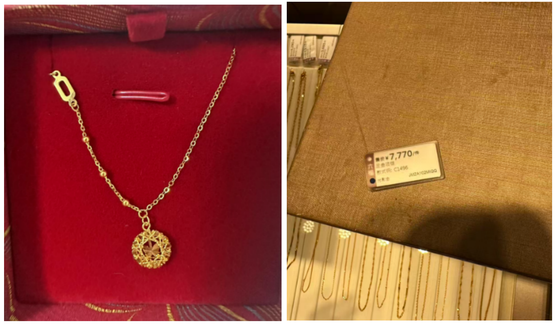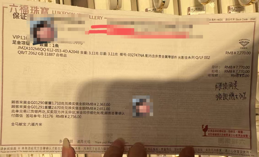“7770元就算按现在的金价我都可以买5克左右的项链,干嘛要3克的‘一口价’黄金?”今年2月,消费者王女士(化名)在深圳某商场内的六福珠宝门店用总克重4.38克的旧黄金置换了1件仅3.11克的黄金项链。该黄金项链品类为“一口价”黄金饰品,即按件计价,其价格标签为7770元/件。店员将王女士带来置换的旧金折算为5014元,为购入这件“一口价”黄金项链,王女士还补了2756元差价。