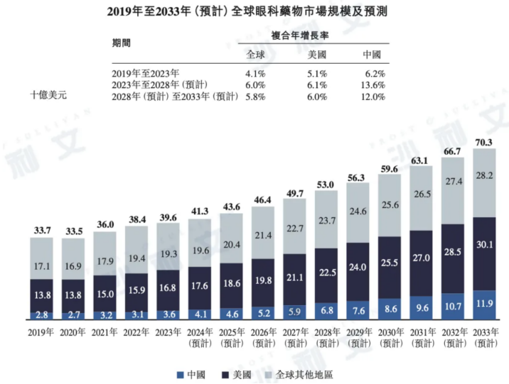 近年来,随着居民健康意识的提升,眼健康也越来越受关注,带动眼科药物市场迎来广阔发展空间。数据显示,全球眼科药物市场预计将于2033年达到约703亿美元,其中中国眼科药物市场预计将于2032年将突破百亿美元,并于2033年达到119亿美元,市场空间巨大。