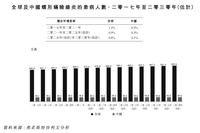 据悉,蠕形螨感染非常普遍,且极具传染性,发病率也会随着年龄的增长而增加。有研究数据显示,全球蠕形螨感染率约为60%,在70岁以上人群中,感染率达到总人口的100%。具体到患者规模,在美国,约有2500万患者深受蠕形螨睑缘炎困扰,全球范围内蠕形螨睑缘炎的患者已超过4亿人,预计2029年将超过5亿患者,其中中国的患者规模常年稳居在5000万以上,临床需求十分迫切,市场规模庞大。