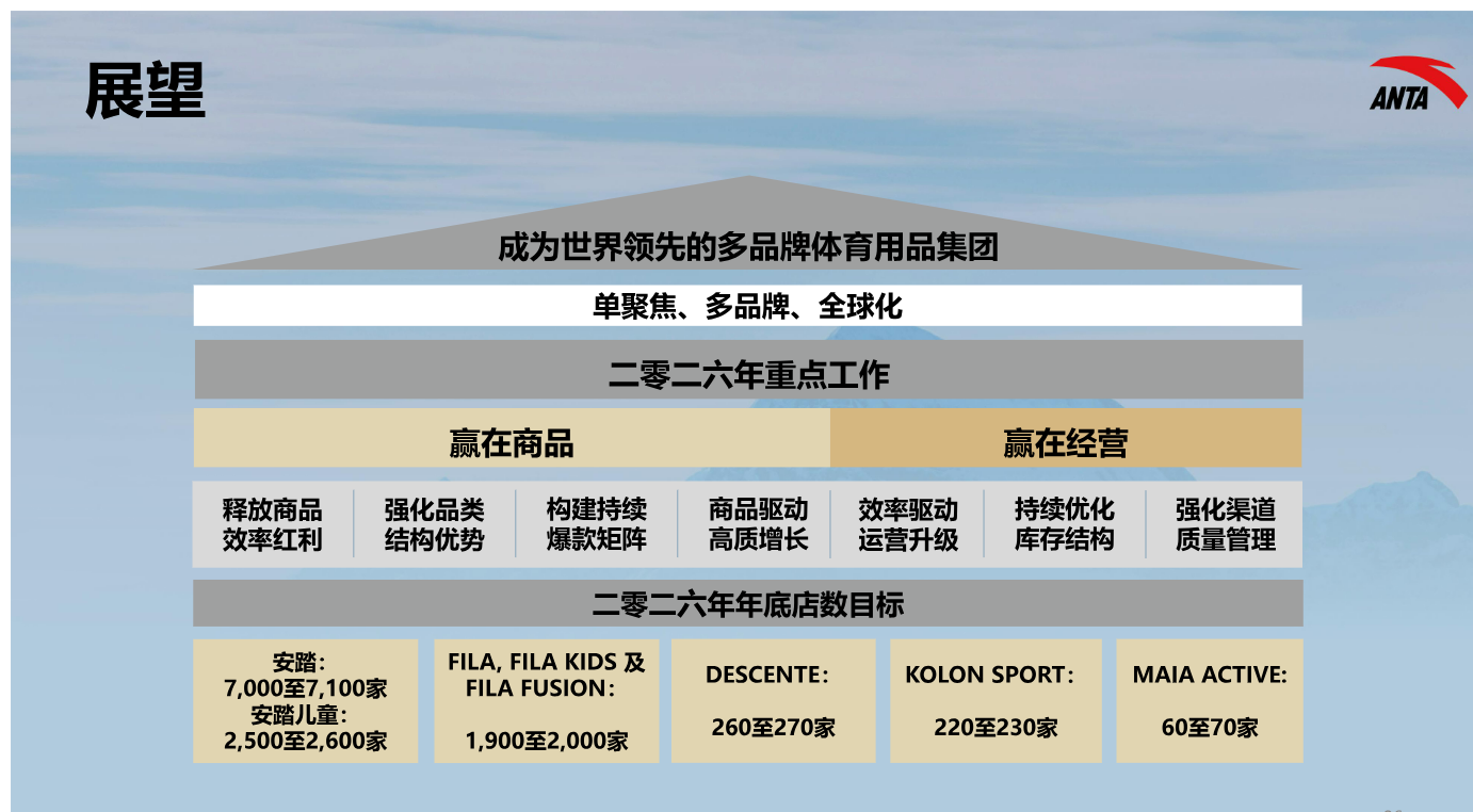 在对2026年的规划中,公司并未选择全面扩张。安踏主品牌门店将适度调优至7000至7100家,安踏儿童收缩至2500至2600家;与此同时,FILA计划扩张至1900至2000家,迪桑特、克隆及MAIA ACTIVE亦将继续增加门店数量。