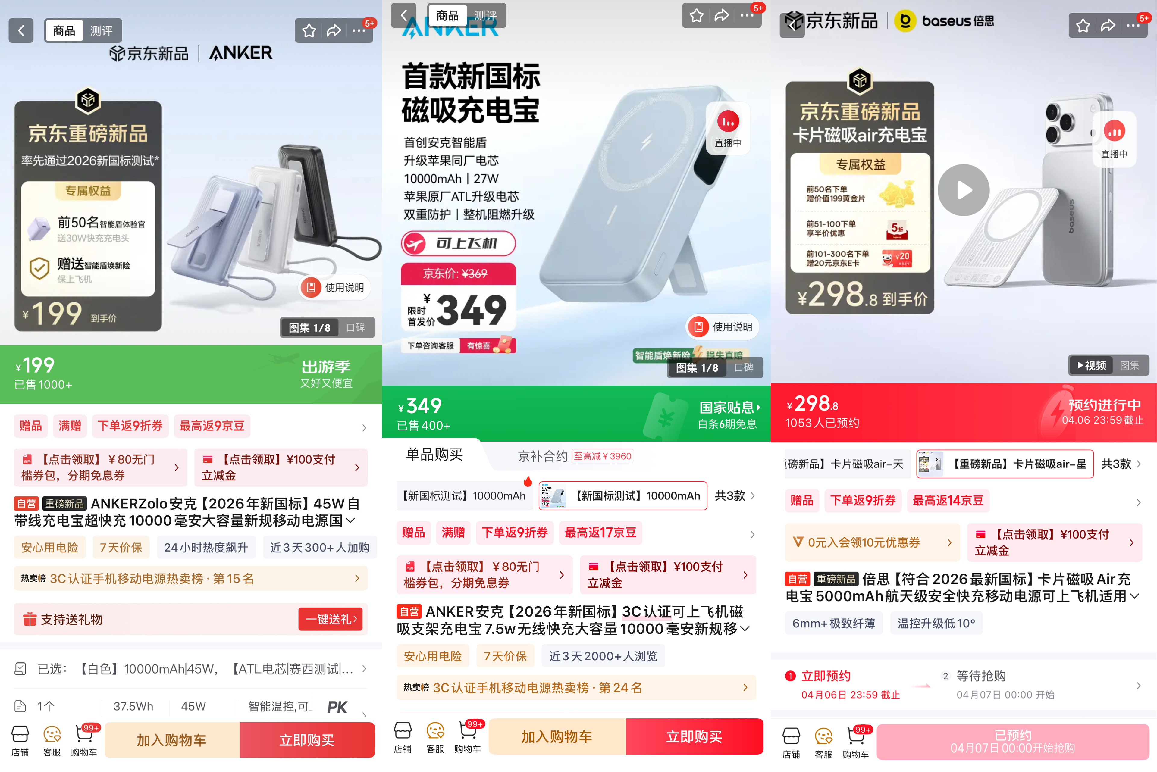 倍思、安克等告诉《消费者报道》,公司已有符合新国标的产品面世。安克还透露,公司本月还将陆续发布两款通过新国标测试的磁吸充电宝新品。