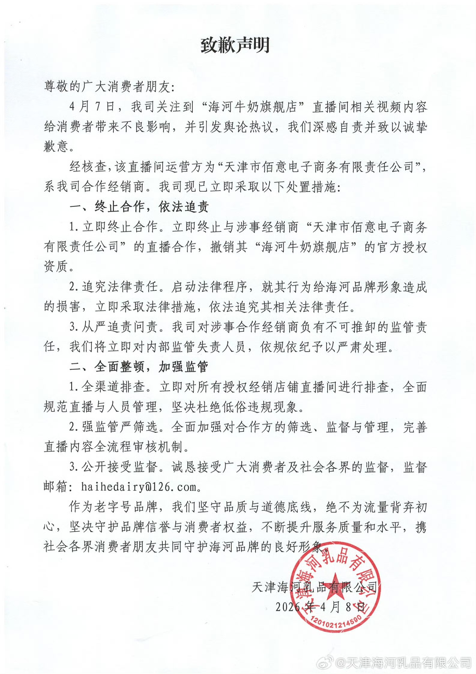声明显示,涉事直播间运营方天津市佰意电子商务有限责任公司为海河的合作经销商。目前,海河已终止与该经销商的直播合作,撤销其“海河牛奶旗舰店”官方授权资质,并将就该行为对海河品牌形象造成的损害启动法律程序。