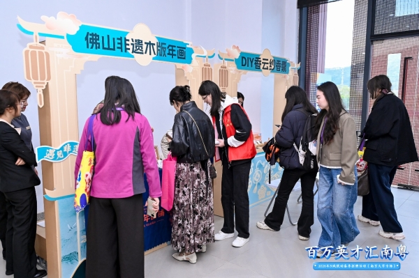 除了硬核的岗位与政策,非遗文化展示区同样人气高涨。木版年画、香云纱手工香囊等岭南特色文化互动体验,让学子们在求职之余,沉浸式感受佛山的城市温度与人文魅力。