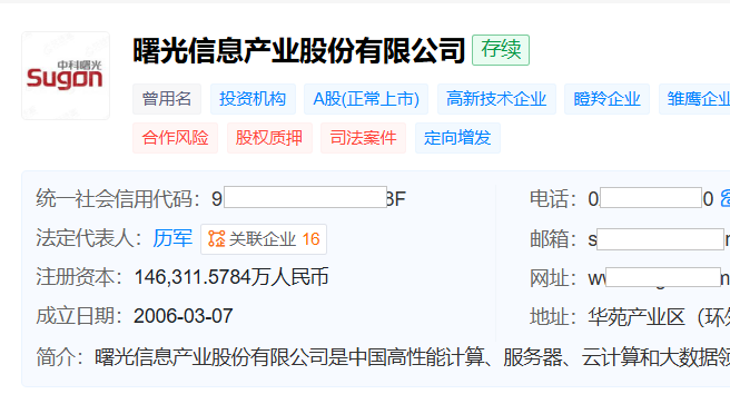 天眼查显示,中科曙光注册地位于天津市,2014年11月在上交所主板上市,主要从事高端计算机、存储、安全、数据中心产品的研发及制造,聚焦算力基础设施全产业链。