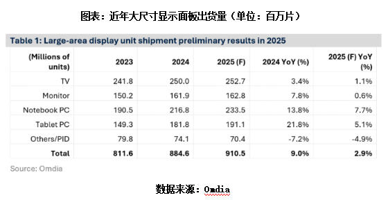 步入2025年,面板行业进入弱周期新阶段。据市场研究机构Omdia数据,2025年大尺寸显示面板出货量预计同比增长2.9%,该增速低于2024年9.0%的同比增幅。其中Monitor(显示器)的增速预计同比仅增长0.6%,维持低位运行。上游面板厂商纷纷通过控产稳价策略维持行业平衡,而下游终端市场却深陷需求疲软与价格内卷的双重困境。